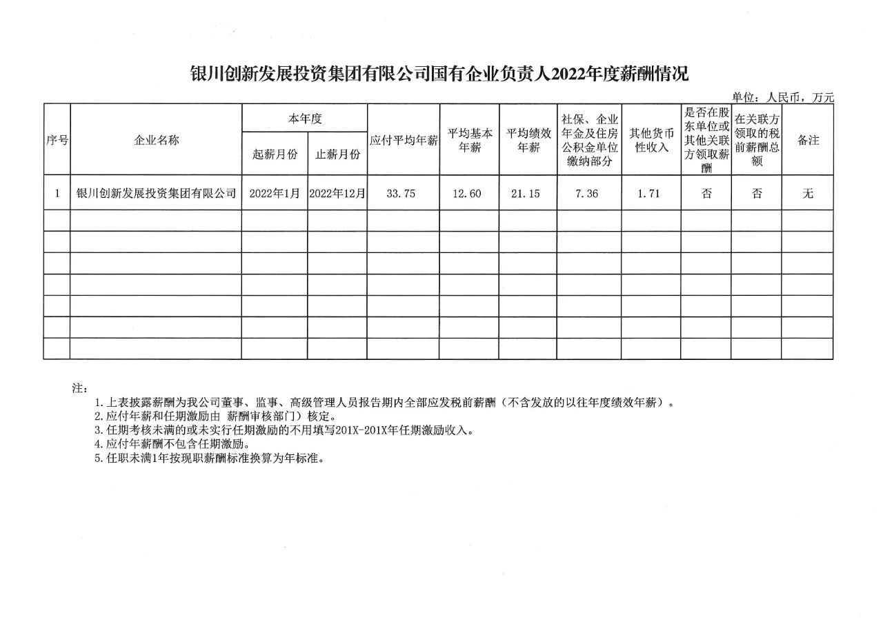 根據(jù)《銀川市屬?lài)?guó)有企業(yè)負(fù)責(zé)人薪酬管理辦法(試行)》(銀國(guó)資發(fā)〔2021〕458號(hào))、《銀川市屬?lài)?guó)有企業(yè)負(fù)責(zé)人經(jīng)營(yíng)業(yè)績(jī)考核辦法(試行)》(銀國(guó)資發(fā)〔2021〕459號(hào))、《銀川市屬?lài)?guó)有企業(yè)負(fù)責(zé)人經(jīng)營(yíng)業(yè)績(jī)考核實(shí)施細(xì)則(試行)》規(guī)定,經(jīng)銀川市國(guó)資委核定,現(xiàn)將銀川創(chuàng)新發(fā)展投資集團(tuán)有限公司企業(yè)負(fù)責(zé)人2022年度薪酬信息予以披露。